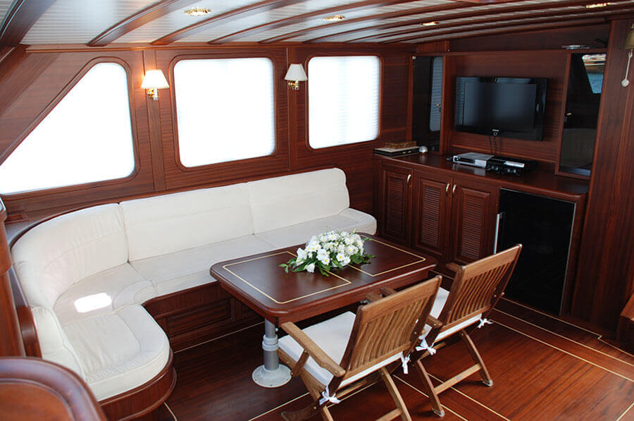 8 Gäste in 4 klimatisierten Kabinen (2 Doppel + 2 Twin), alle mit eigenem Bad und WCSegel-Gulet mit Ketschrigg, Länge über Deck 24,00 m, Breite 6,30 m, Tiefgang 2,80 m, Rumpf Mahagoni, Deck Teak. Flagge türkisch.