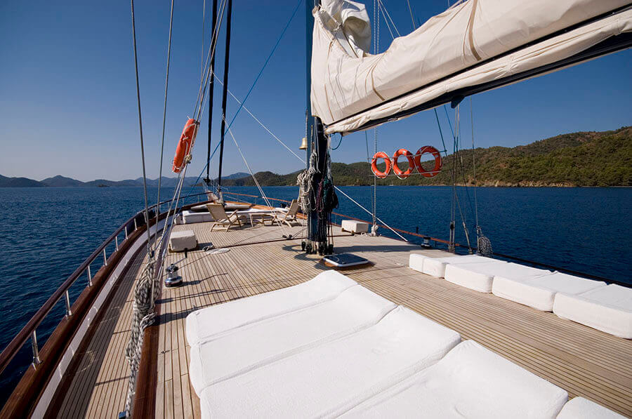 10 Gäste in 5 klimatisierten Kabinen (1 Master + 4 Doppel), alle mit eigenem Bad und WCGulet mit Ketschrigg, Länge über Deck 34 m, Breite 8,20 m, Tiefgang 3,25 m, Rumpf und Aufbauten Mahagony-Epoxy, Deck Teak, Segelfläche 592 m2, Baujahr 2007, Flagge TR.