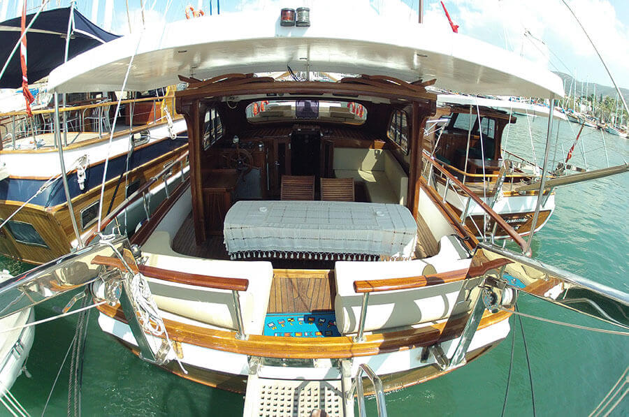 4 Gäste in 2 klimatisierten Kabinen, jede mit eigener Dusche und WCKleine Gulet mit Sluprigg, Länge über Deck 15 m, Breite 4,85 m, Tiefgang 1,20 m, Rumpf und Aufbauten Ajacou und Mahagony, Deck Iroco. Baujahr 2012, Flagge TR.